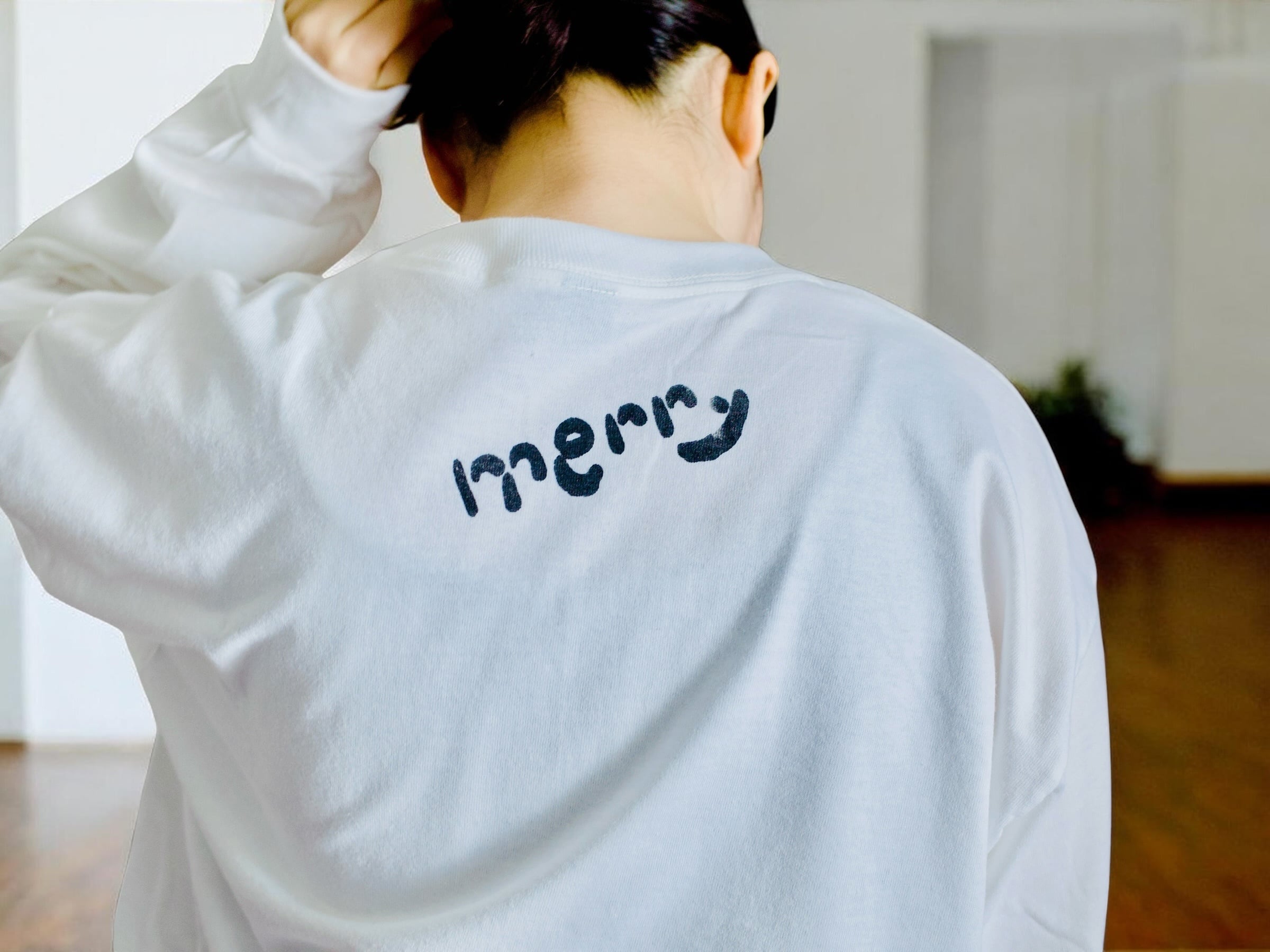 背中には「merry」のロゴをプリントしました。